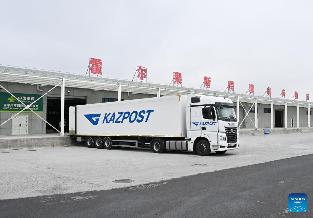 Un camión postal de Kazajistán carga correo internacional en la estación de intercambio de correo internacional en Horgos, región autónoma uygur de Xinjiang, noroeste de China, el 11 de septiembre de 2025. La estación de intercambio en Horgos se puso oficialmente en operación en julio de 2022, proveyendo soluciones integrales para el almacenamiento y logística de la cadena industrial de comercio electrónico transfronterizo. En los últimos tres años, ha intercambiado 2.026 toneladas de correo internacional en total. (Xinhua/Li He).