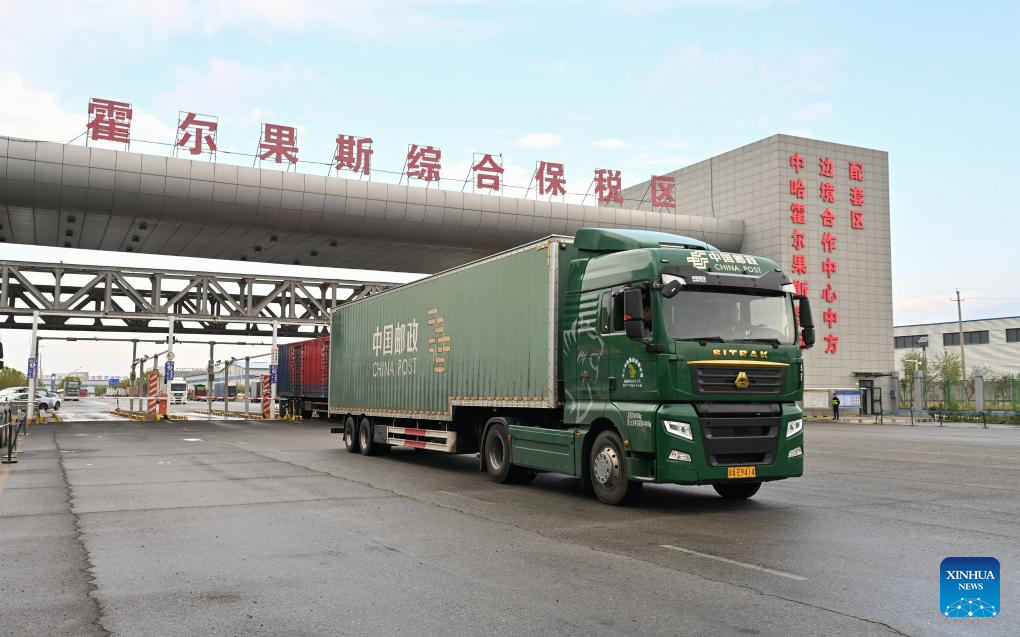 Un camión postal sale de la zona franca integral de Horgos en Horgos, región autónoma uygur de Xinjiang, noroeste de China, el 11 de septiembre de 2025. La estación de intercambio en Horgos se puso oficialmente en operación en julio de 2022, proveyendo soluciones integrales para el almacenamiento y logística de la cadena industrial de comercio electrónico transfronterizo. En los últimos tres años, ha intercambiado 2.026 toneladas de correo internacional en total. (Xinhua/Li He).