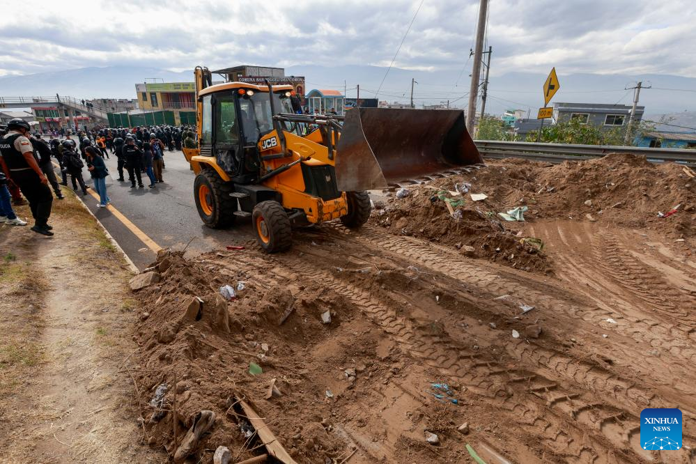 Maquinaria retira escombros colocados como barricada durante una protesta por la eliminación del subsidio al diésel, en Quito, capital de Ecuador, el 16 de septiembre de 2025. El presidente de Ecuador, Daniel Noboa, decretó el martes estado de excepción por 60 días en siete provincias del país por "grave conmoción interna", derivada de las protestas y bloqueos de carreteras iniciados la víspera por gremios de transportistas en rechazo a la reciente eliminación del subsidio al diésel. (Xinhua/Ricardo Landeta)