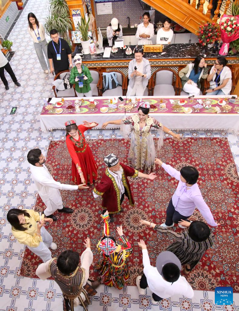 Turistas bailan con miembros del personal en un alojamiento familiar de la ciudad antigua de Kashgar, en la región autónoma uigur de Xinjiang, noroeste de China, el 10 de septiembre de 2025. (Xinhua/Cheng Li).