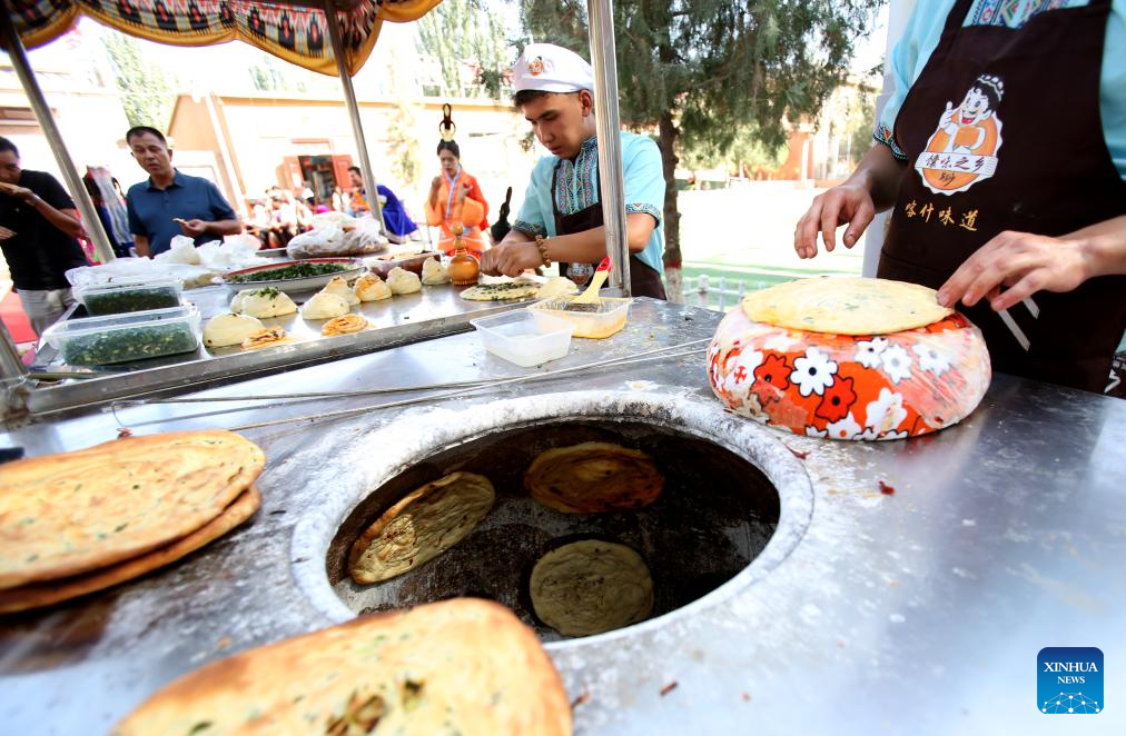 Unos aldeanos hacen pan naan para los turistas en una aldea del distrito de Yengisar de Kashgar, en la región autónoma Uigur de Xinjiang, noroeste de China, el 11 de septiembre de 2025. (Xinhua/Cheng Li).