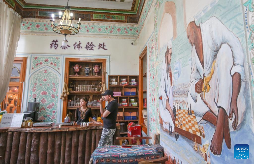 Esta foto muestra una casa de té de hierbas en el centro de la ciudad antigua de Kashgar, en la región autónoma uigur de Xinjiang, en el noroeste de China, el 10 de septiembre de 2025. (Xinhua/Cheng Li).