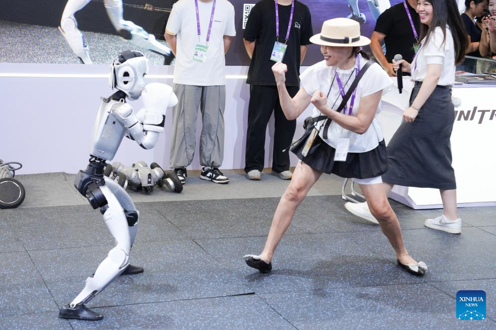 Un robot humanoide boxea con una visitante en el Centro Internacional de Convenciones y Exposiciones de Nanning, en Nanning, capital de la región autónoma de la etnia zhuang de Guangxi, en el sur de China, el 19 de septiembre de 2025. Productos que incorporan tecnologías de vanguardia, como la inteligencia artificial, la economía de baja altitud y los robots humanoides son exhibidos durante la 22ª Exposición China-ASEAN que se celebra actualmente. (Xinhua/Zhou Tinglu)