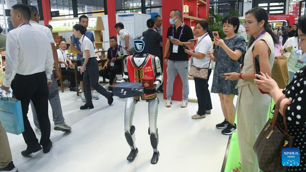 Un robot humanoide sirve té en el Centro Internacional de Convenciones y Exposiciones de Nanning, en Nanning, capital de la región autónoma de la etnia zhuang de Guangxi, en el sur de China, el 19 de septiembre de 2025. Productos que incorporan tecnologías de vanguardia, como la inteligencia artificial, la economía de baja altitud y los robots humanoides son exhibidos durante la 22ª Exposición China-ASEAN que se celebra actualmente. (Xinhua/Zhang Ailin)