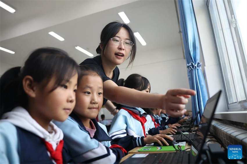 Wang Zhiying (3.ª a la izquierda), voluntaria de la multinacional tecnológica china Lenovo, imparte una charla sobre inteligencia artificial en el aula de informática de la escuela Yanchuan del distrito de Zhangxian, en la ciudad de Dingxi, provincia de Gansu, noroeste de China, el 10 de septiembre de 2025.