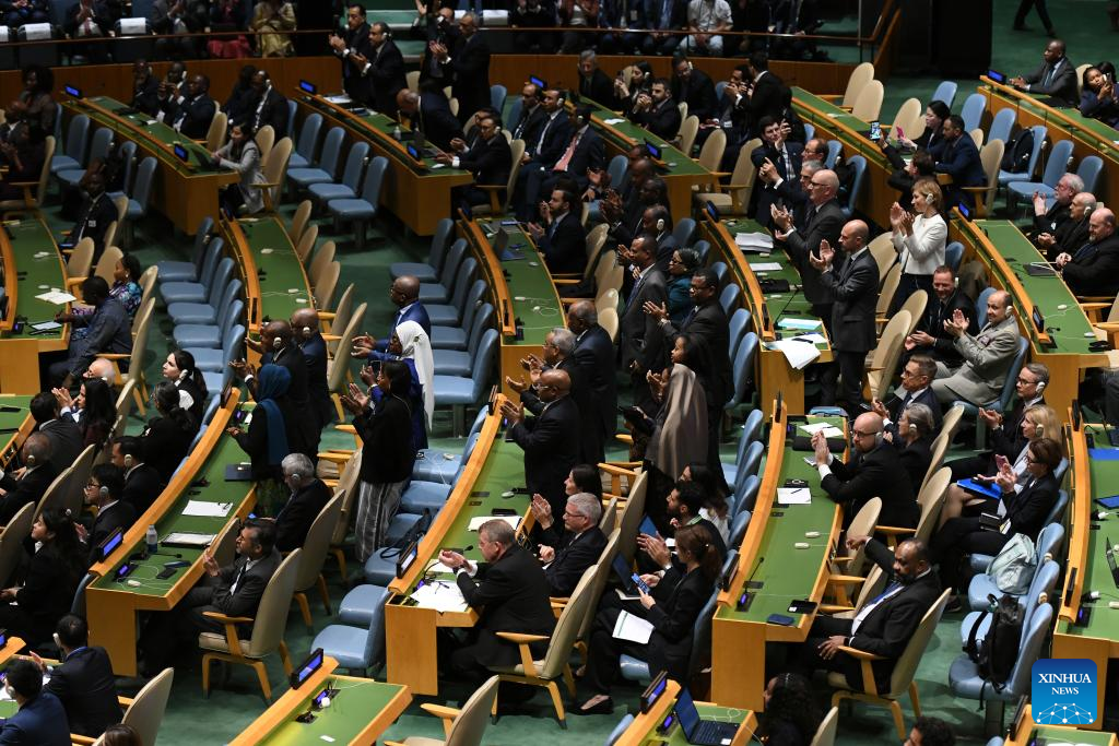 Delegados aplauden mientras el presidente francés, Emmanuel Macron, habla durante la Conferencia Internacional de Alto Nivel para la Solución Pacífica de la Cuestión de Palestina y la Implementación de la Solución de dos Estados, en la sede de la Organización de las Naciones Unidas (ONU), en Nueva York, el 22 de septiembre de 2025. Macron dijo el lunes en una reunión de la ONU sobre la solución de dos Estados que su país reconoce al Estado de Palestina, con lo que se une a la mayoría de los demás Estados miembros de la ONU que ya lo han hecho. (Xinhua/Li Rui)