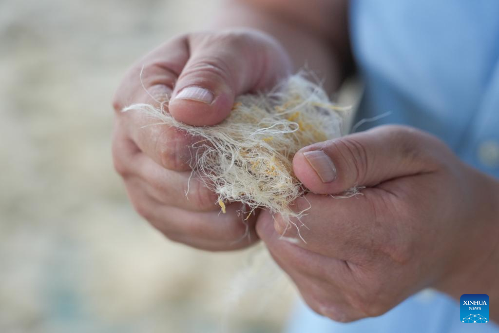 Imagen del 20 de septiembre de 2025 de un trabajador verificando la calidad del producto en un taller de desgomado de fibras de una empresa textil, en el distrito de Yuli, en la región autónoma uygur de Xinjiang, en el noroeste de China. Aprovechando las características de la apocynum venetum de resistencia a la sequía, tolerancia a la sal y los álcalis, resistencia al frío y al calor, resistencia al viento y la arena, y fuerte adaptabilidad ecológica, las autoridades locales del distrito de Yuli, que se encuentra al borde del desierto de Taklimakan, han realizado esfuerzos para frenar la desertificación, promover el empleo y aumentar los ingresos de la población local mediante el desarrollo de la industria de apocynum venetum. (Xinhua/Wang Zhipeng)