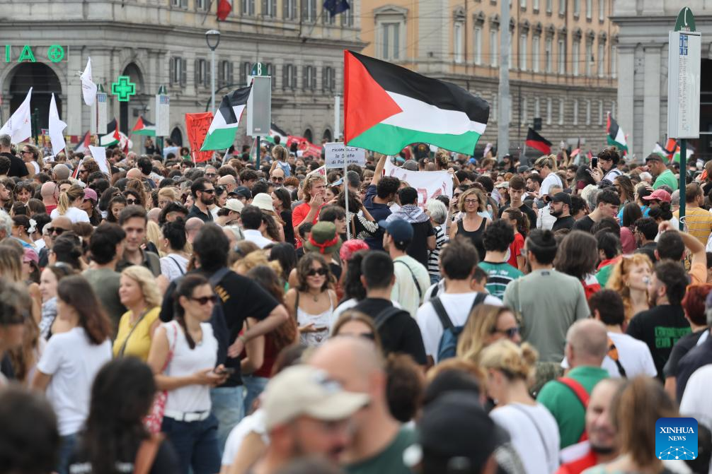 Multitud de personas se congregan en una plaza de Roma, Italia, con motivo de una protesta a favor de Palestina, el 22 de septiembre de 2025. (Xinhua/Li Jing).