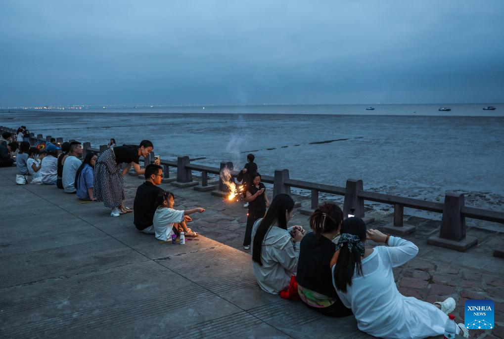 Personas esperan el amanecer junto al mar en el distrito de Haiyan, ciudad de Jiaxing, provincia de Zhejiang, este de China, el 20 de septiembre de 2025. (Xinhua/Xu Yu).
