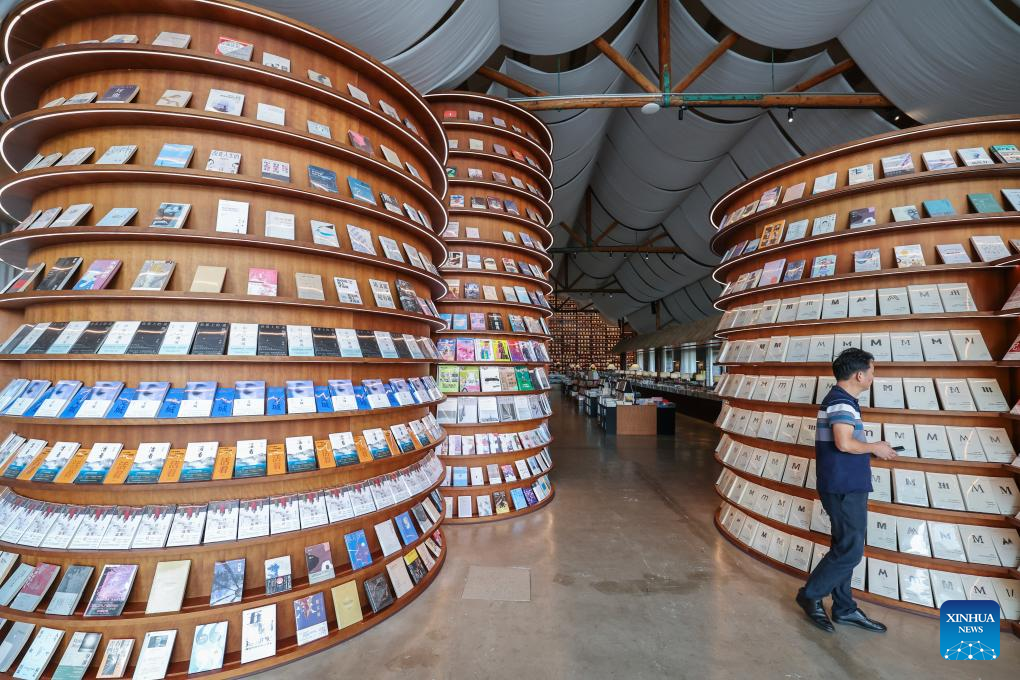 En la foto, tomada el 19 de septiembre de 2025, se ve una librería en un parque industrial cultural reformado a partir de un granero en Shendang, distrito de Haiyan, ciudad de Jiaxing, provincia de Zhejiang, este de China. (Xinhua/Xu Yu).