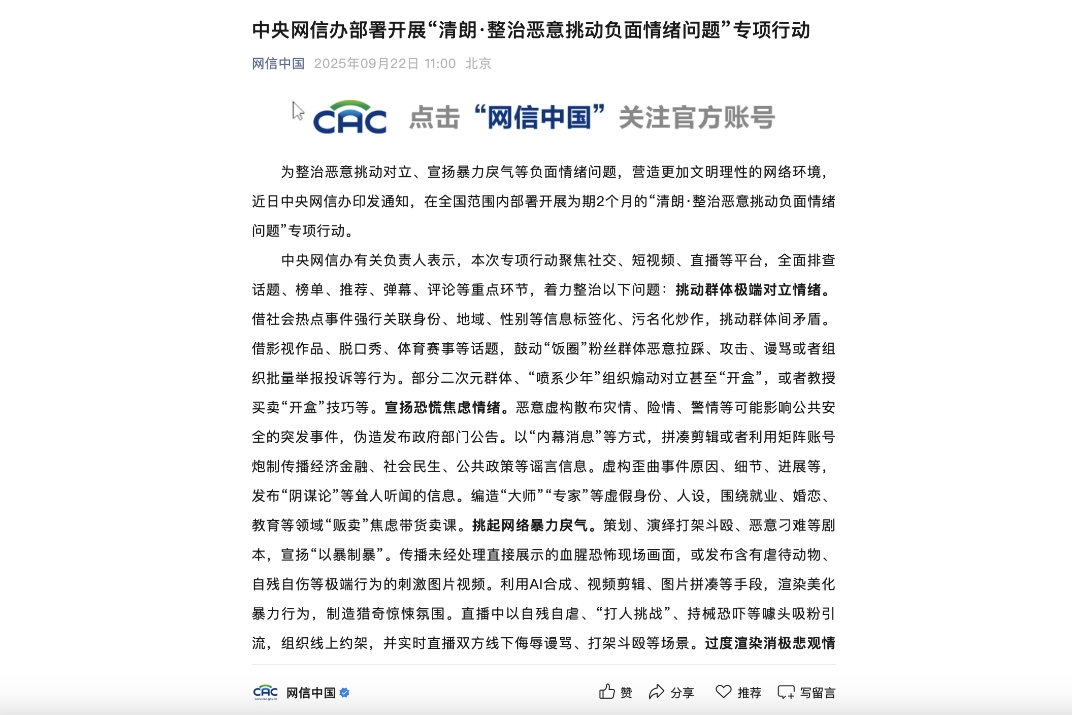 La administración tomará acciones severas contra las actividades que propaguen el miedo y la ansiedad. Entre ellas la fabricación y difusión maliciosa de información falsa sobre desastres, accidentes, incidentes de seguridad pública u otras emergencias que puedan afectar a la seguridad pública, así como la falsificación y publicación de anuncios gubernamentales falsos; la invención y edición de contenidos o el uso de cuentas vinculadas para crear y difundir rumores sobre la economía, las finanzas, la vida social o políticas públicas so pretexto de «información privilegiada»; inventar o distorsionar las causas, los detalles o la evolución de los eventos para publicar «teorías conspirativas» sensacionalistas; y crear identidades o personajes falsos como «maestros» o «expertos» para disparar la ansiedad y vender productos o cursos relacionados con el empleo, las relaciones, la educación y otros temas.
