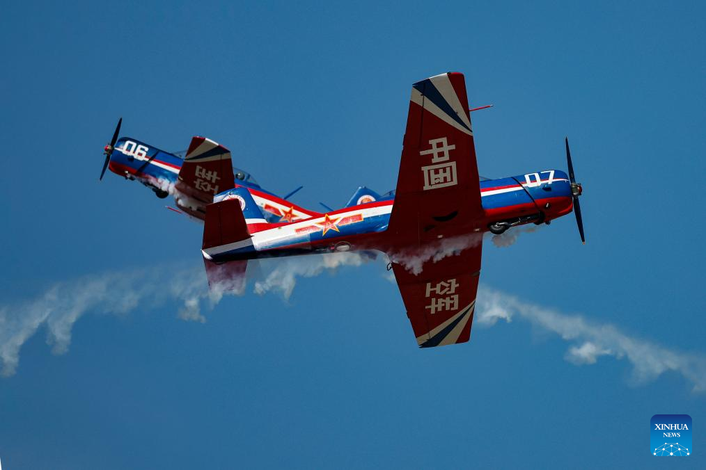 Exhibición del equipo acrobático Tianzhiyi durante la jornada de puertas abiertas 2025 de la Fuerza Aérea del Ejército Popular de Liberación de China y el Salón Aeronáutico de Changchun, Changchun, provincia de Jilin, en el noreste de China, 23 de septiembre de 2025. Ambos eventos concluyeron el martes. (Tan Sicheng/Xinhua)