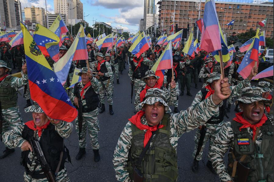 Bajo carpas blancas instaladas cerca de una plaza en el centro de Caracas, la capital de Venezuela, decenas de milicianos y residentes escuchan con atención a soldados que imparten técnicas de combate.