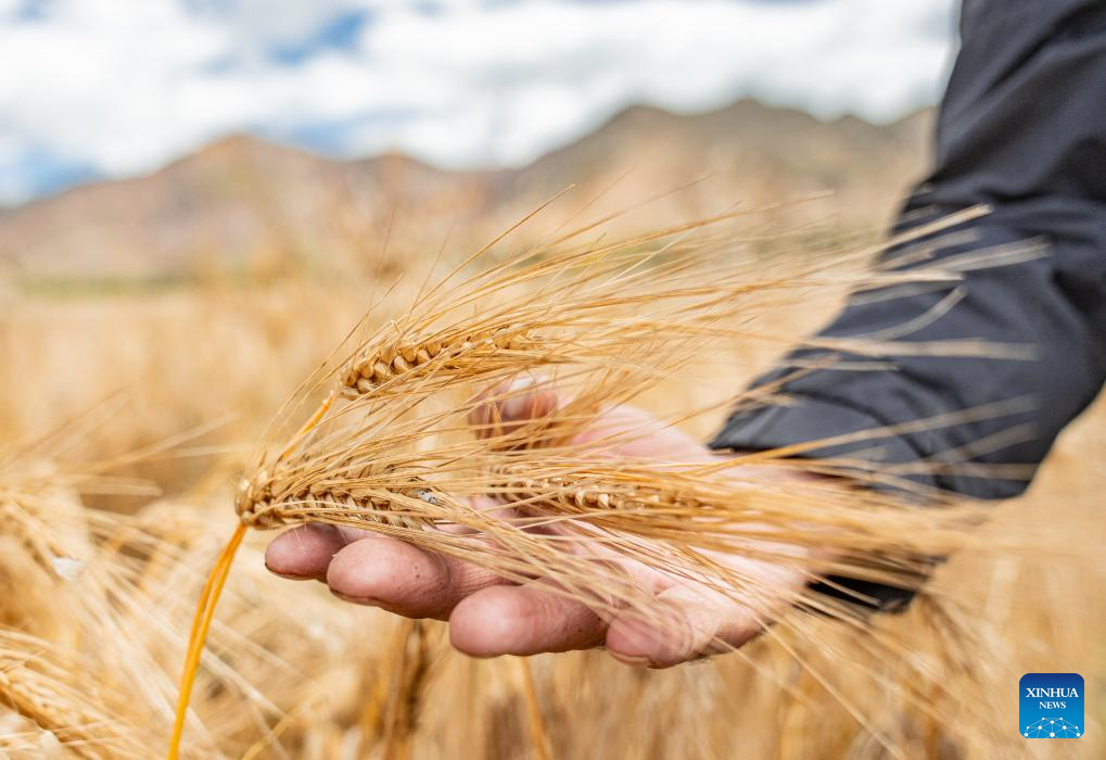 Esta foto tomada el 23 de septiembre de 2025 muestra espigas de cebada de las mesetas en el distrito de Lhunzhub, en Lhasa, región autónoma de Xizang, en el suroeste de China. (Xinhua/Tenzin Nyida).