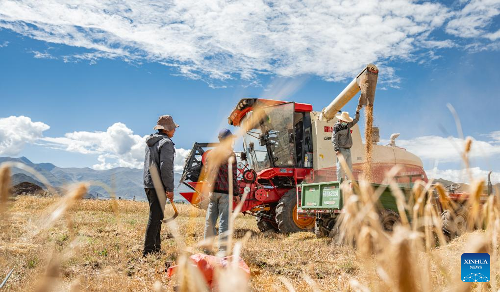 Agricultores cosechan cebada de las mesetas con una cosechadora en el distrito de Lhunzhub, en Lhasa, región autónoma de Xizang, en el suroeste de China, el 23 de septiembre de 2025. (Xinhua/Tenzin Nyida).