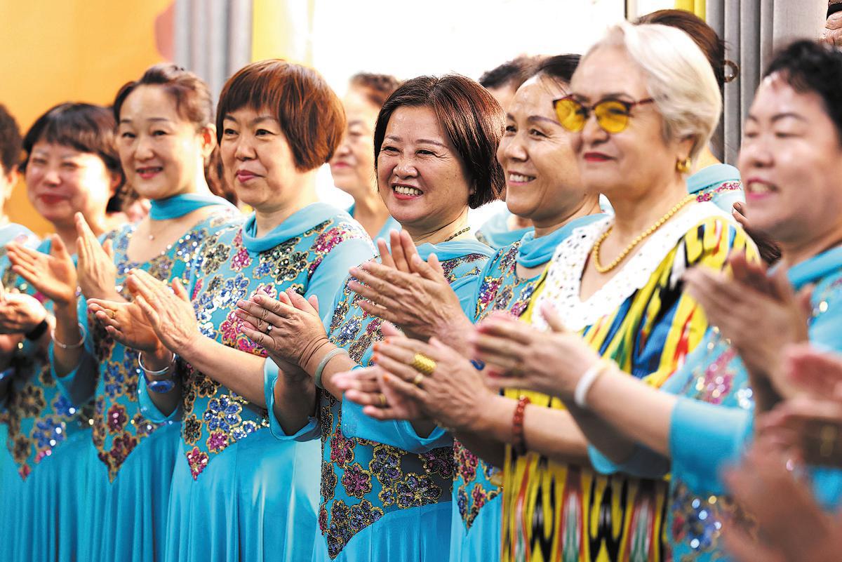 El coro de personas mayores «Starlight», en la comunidad de la calle Guyuan, distrito de Tianshan, Urumqi, aplauden en señal de celebración, 8 de septiembre. ZHU XINGXIN/ DIARIO DE CHINA
