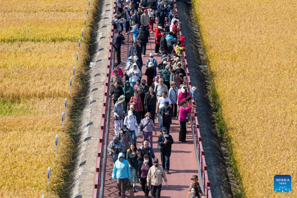 Un nutrido grupo de personas recorre un evento que celebra el octavo festival de la cosecha de los agricultores chinos en un parque de arte en la provincia de Heilongjiang, en el noreste de China, el 23 de septiembre de 2025. El festival de la cosecha de los agricultores chinos es el primer festival nacional creado específicamente para los agricultores del país. A partir de 2018, el festival coincide con el equinoccio de otoño cada año, que es uno de los 24 términos solares del calendario lunisolar chino y generalmente cae entre el 22 y el 24 de septiembre durante la temporada de cosecha agrícola del país. (Xinhua/Zhang Tao).