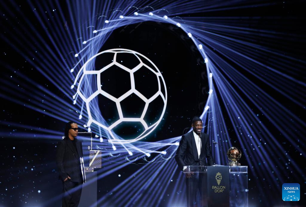 Imagen del 22 de septiembre de 2025 del jugador francés de Paris Saint-Germain, Ousmane Dembele (d), hablando después de ganar el Balón de Oro masculino durante la ceremonia de premiación del Balón de Oro 2025 de France Football en el Teatro del Chatelet, en París, Francia. (Xinhua/Gao Jing)