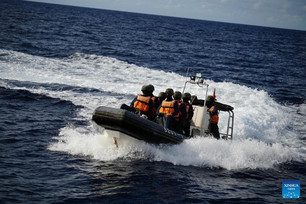 Imagen del 4 de septiembre de 2025 de agentes del orden del buque Chigua de la Guardia Costera de China (GCCh) realizando una misión de aplicación de la ley en el Mar Meridional de China. Formaciones de buques del V Buró de la GCCh recientemente realizaron patrullajes policiales en aguas cercanas a Ren'ai Jiao de China. Las actividades de aplicación de la ley de la GCCh han mantenido la seguridad marítima y salvaguardado la soberanía territorial y los derechos e intereses marítimos de China en la región. (Xinhua/Xu Hongyan)