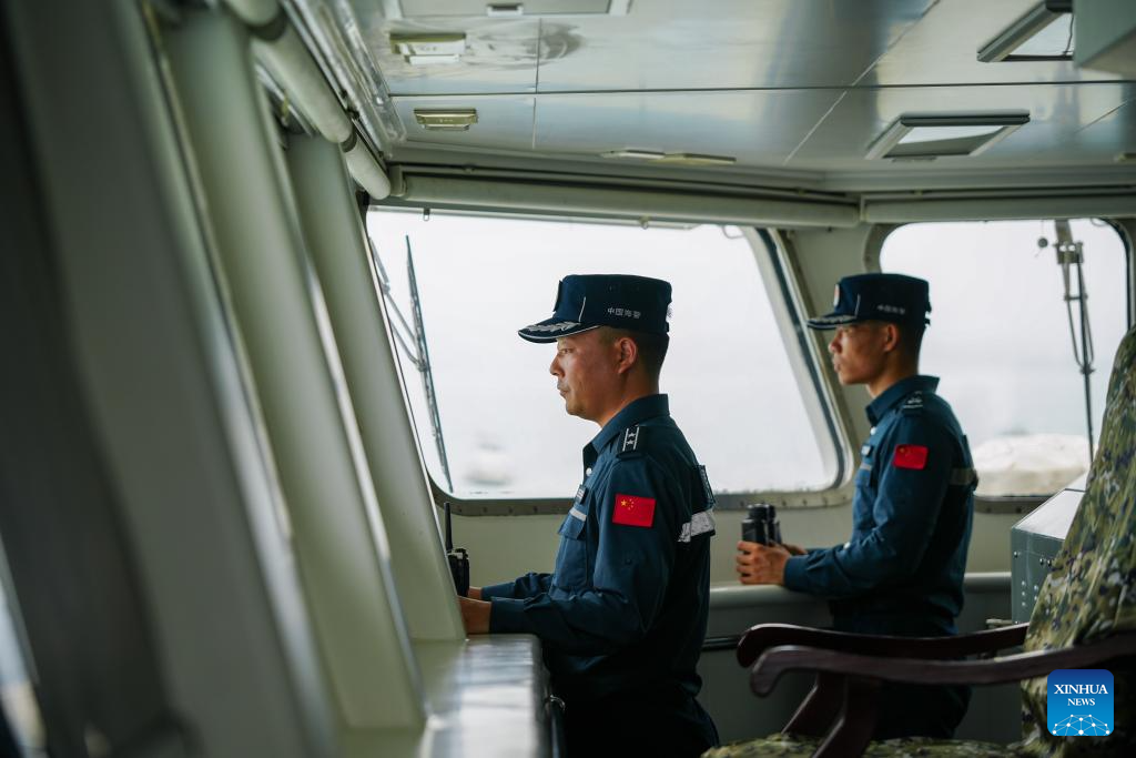 Imagen del 6 de agosto de 2025 de agentes del orden vigilando en el buque Huayang de la Guardia Costera de China (GCCh) en las aguas cerca de Sanya, en la provincia de Hainan, en el sur de China. Formaciones de buques del V Buró de la GCCh recientemente realizaron patrullajes policiales en aguas cercanas a Ren'ai Jiao de China. Las actividades de aplicación de la ley de la GCCh han mantenido la seguridad marítima y salvaguardado la soberanía territorial y los derechos e intereses marítimos de China en la región. (Xinhua/Xu Hongyan)