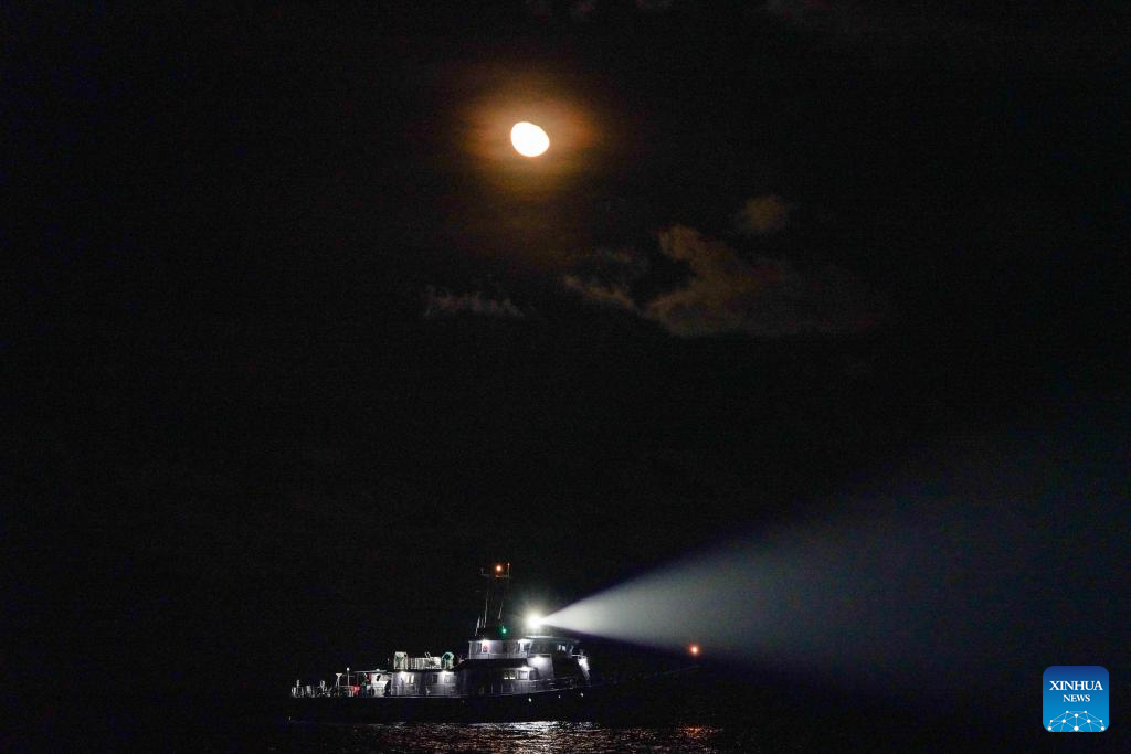 Imagen del 11 de septiembre de 2025 del buque Dahe de la Guardia Costera de China (GCCh) navegando bajo la luz de la luna, en el Mar Meridional de China. Formaciones de buques del V Buró de la GCCh recientemente realizaron patrullajes policiales en aguas cercanas a Ren'ai Jiao de China. Las actividades de aplicación de la ley de la GCCh han mantenido la seguridad marítima y salvaguardado la soberanía territorial y los derechos e intereses marítimos de China en la región. (Xinhua/Xu Hongyan)