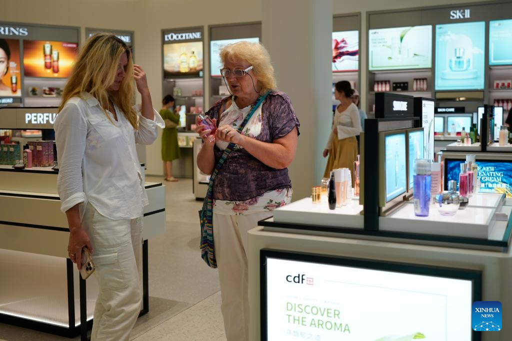 Turistas extranjeras compran perfume en la Tienda Libre de Impuestos del Centro de Chengdu, en Chengdu, en la provincia de Sichuan, en el suroeste de China, el 25 de septiembre de 2025. La primera tienda libre de impuestos del centro de Chengdu abrió el jueves en el distrito comercial de la calle Chunxi, incluida la zona libre de impuestos y la zona de impuestos pagados. (Xinhua/Xu Bingjie)