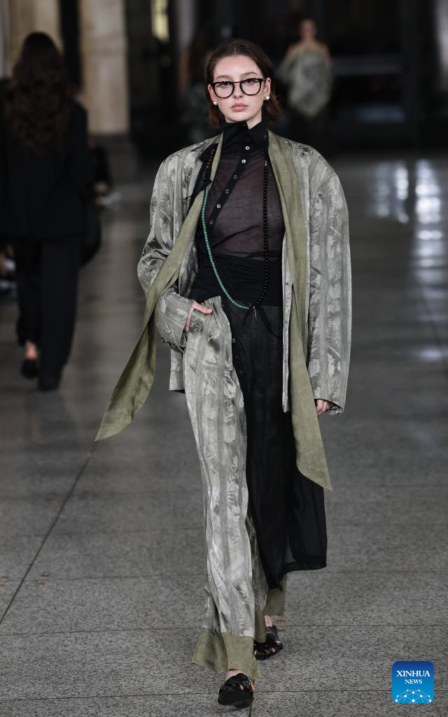 Imagen del 24 de septiembre de 2025 de una modelo presentando una creación de las colecciones de ropa de mujer Primavera/Verano 2026 de la marca china ROSEOCEAN durante la Semana de la Moda de Milán, en Milán, Italia. (Xinhua/Li Jing)