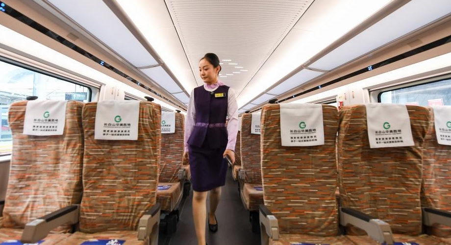 Una sobrecargo patrulla en un tren de la sección Shenyang-Baihe del Ferrocarril de Alta Velocidad Shenyang-Jiamusi, el 28 de septiembre de 2025. Una nueva vía ferroviaria de alta velocidad comenzó a operar el domingo, acortando significativamente el tiempo de viaje de Beijing a la conocida montaña Changbai en la provincia nororiental de Jilin, dando aún mayor un impulso al creciente mercado chino de deportes de invierno y turismo de hielo y nieve. El tramo Shenyang-Baihe del ferrocarril de alta velocidad Shenyang-Jiamusi, diseñado para alcanzar una velocidad de 350 kilómetros por hora, comenzó oficialmente a prestar servicio el domingo. (Xinhua/Zhang Nan)