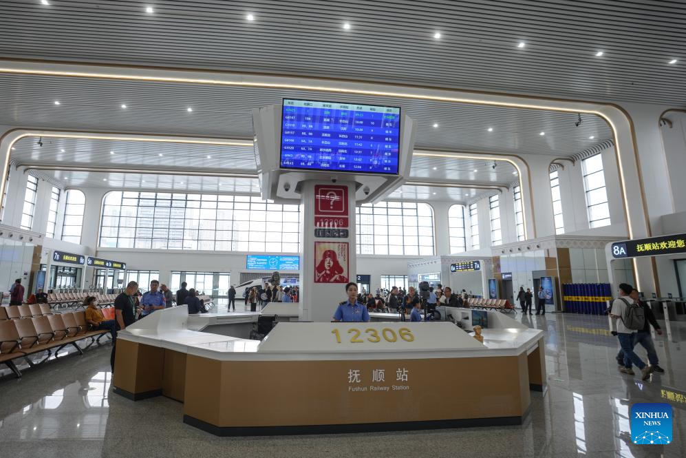 Imagen del 28 de septiembre de 2025 de una sala de espera de la Estación de Ferrocarril de Fushun, en Fushun, en la provincia de Liaoning, en el noreste de China. Una nueva vía ferroviaria de alta velocidad comenzó a operar el domingo, acortando significativamente el tiempo de viaje de Beijing a la conocida montaña Changbai en la provincia nororiental de Jilin, dando aún mayor un impulso al creciente mercado chino de deportes de invierno y turismo de hielo y nieve. El tramo Shenyang-Baihe del ferrocarril de alta velocidad Shenyang-Jiamusi, diseñado para alcanzar una velocidad de 350 kilómetros por hora, comenzó oficialmente a prestar servicio el domingo. (Xinhua/Pan Yulong)