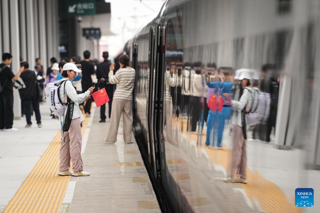 Una pasajera se prepara para abordar un tren en la sección Shenyang-Baihe del Ferrocarril de Alta Velocidad Shenyang-Jiamusi, en la Estación de Ferrocarril de Fushun, en Fushun, en la provincia de Liaoning, en el noreste de China, el 28 de septiembre de 2025. Una nueva vía ferroviaria de alta velocidad comenzó a operar el domingo, acortando significativamente el tiempo de viaje de Beijing a la conocida montaña Changbai en la provincia nororiental de Jilin, dando aún mayor un impulso al creciente mercado chino de deportes de invierno y turismo de hielo y nieve. El tramo Shenyang-Baihe del ferrocarril de alta velocidad Shenyang-Jiamusi, diseñado para alcanzar una velocidad de 350 kilómetros por hora, comenzó oficialmente a prestar servicio el domingo. (Xinhua/Pan Yulong)