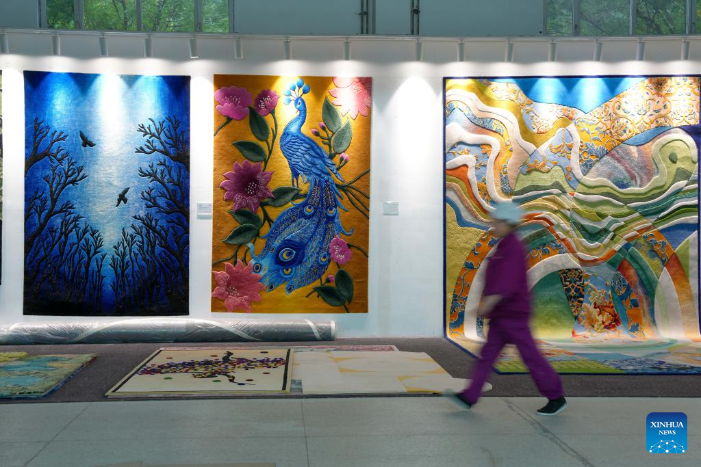 Una empleada camina junto a alfombras tibetanas exhibidas en un taller del grupo de alfombras Shengyuan en Xining, provincia de Qinghai, noroeste de China, 27 de septiembre de 2025. La alfombra tibetana es una artesanía tradicional de la meseta Qinghai-Xizang con una historia de más de 1.000 años. Estas alfombras son artículos esenciales para que los pueblos nómadas de la meseta resistan el frío. La lana fina de yak y oveja, junto con las delicadas técnicas de tejido y los patrones, han hecho que estos productos artesanales sean populares entre clientes nacionales e internacionales. Hoy en día, la alfombra tibetana se ha convertido en una industria que inyecta nuevo impulso a la revitalización rural mientras preserva las habilidades tradicionales. (Xinhua/Du Xiaowei).