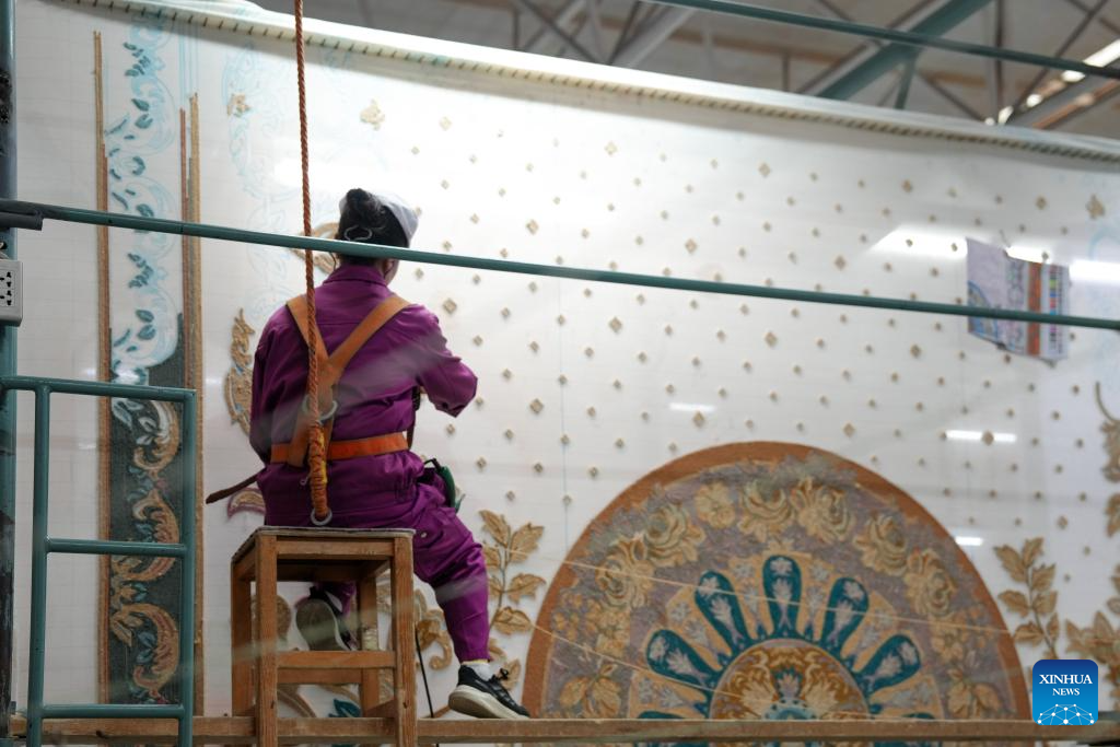 Una empleada trabaja en una alfombra tibetana en un taller del grupo de alfombras Shengyuan en Xining, provincia de Qinghai, noroeste de China, el 27 de septiembre de 2025. (Xinhua/Li Ning).