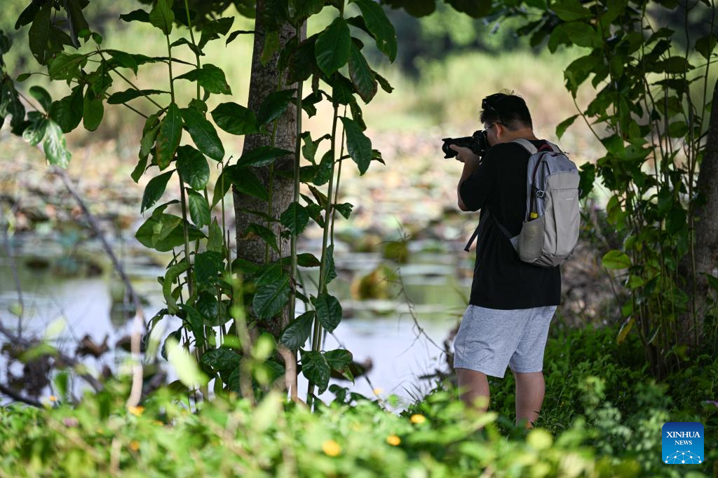 Un turista toma fotografías en el Parque Nacional de Humedales Haiwei en el distrito autónomo de la etnia li de Changjiang, en la provincia de Hainan, sur de China, el 3 de octubre de 2025. (Xinhua/Pu Xiaoxu).
