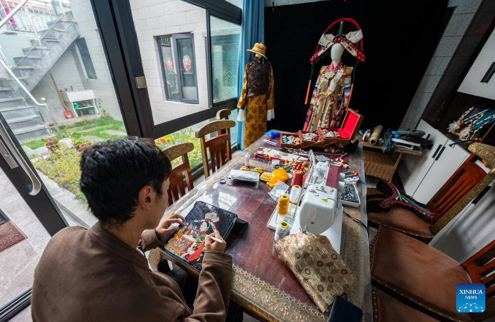 Padruk Tendar diseña un traje tibetano en su casa en Lhasa, en la región autónoma de Xizang, suroeste de China, el 11 de septiembre de 2025. (Xinhua/Tenzin Nyida).