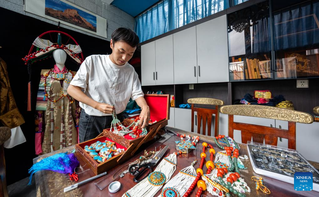 Padruk Tendar organiza accesorios (colllares y pulseras) de estilo tibetano en su casa en Lhasa, en la región autónoma de Xizang, suroeste de China, el 11 de septiembre de 2025. (Xinhua/Tenzin Nyida).