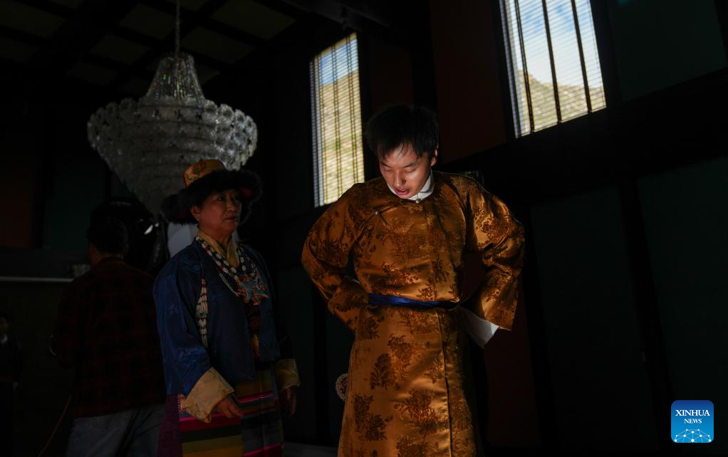 Padruk Tendar (dcha.) se prueba trajes diseñados por él mismo en Lhasa, en la región autónoma de Xizang, suroeste de China, el 9 de septiembre de 2025. (Xinhua/Jigme Dorje).