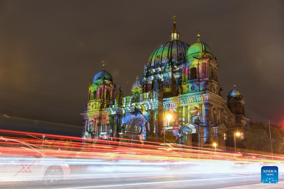 Esta foto de larga exposición tomada el 9 de octubre de 2025 muestra la Catedral de Berlín iluminada durante el Festival de las Luces 2025 en Berlín, Alemania. (Xinhua/Zhang Haofu).