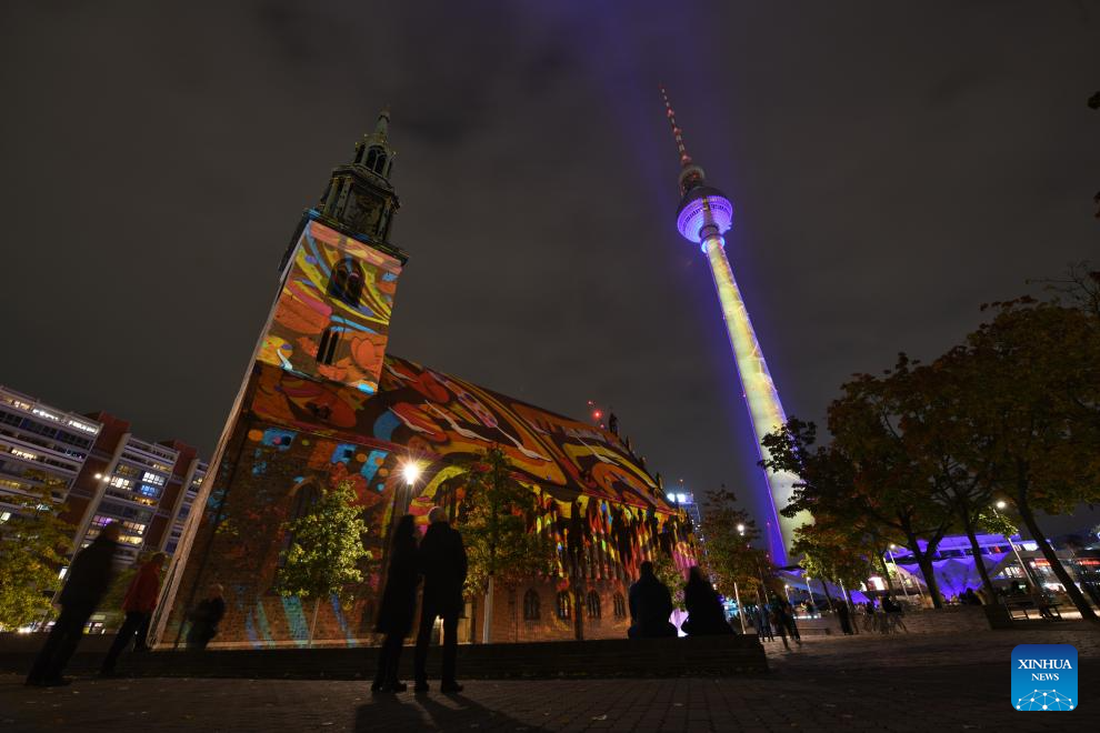 Esta foto de larga exposición tomada el 9 de octubre de 2025 muestra la Torre de la Televisión (derecha) y la Iglesia de Santa María iluminadas durante el Festival de las Luces 2025 en Berlín, Alemania. (Xinhua/Zhang Haofu).