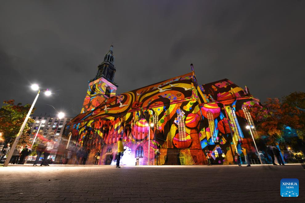 Esta foto de larga exposición tomada el 9 de octubre de 2025 muestra la Iglesia de Santa María iluminada durante el Festival de las Luces 2025 en Berlín, Alemania. (Xinhua/Zhang Haofu).