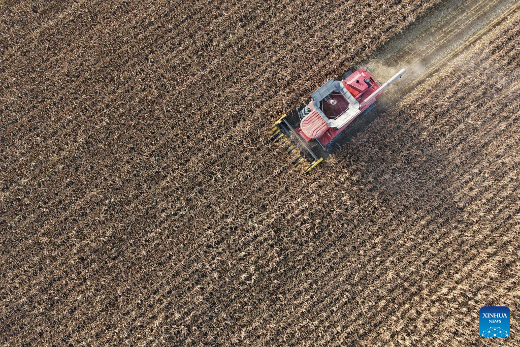 Vista aérea tomada con un dron el 11 de octubre de 2025 de una segadora trabajando en un campo de Sifangshan Farm Co., Ltd. del Grupo Beidahuang, en la ciudad de Zhaodong, en la provincia de Heilongjiang, en el noreste de China. Heilongjiang, el "granero" de China, ha entrado en la temporada de cosecha de otoño. Hasta el 10 de octubre, el Grupo Beidahuang había cosechado 39,6903 millones de mu (2,65 millones de hectáreas), lo que representa el 84,86 por ciento de su total. (Xinhua/Wang Song)