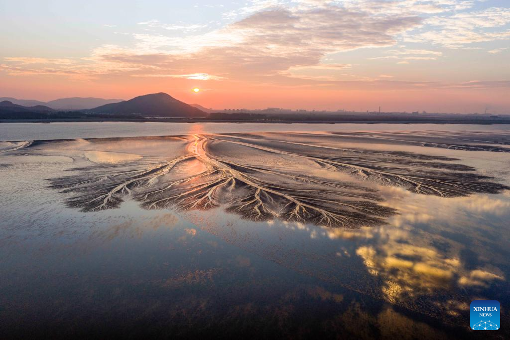 Vista aérea tomada con un dron el 2 de octubre de 2025 de una llanura de marea después del retroceso de la marejada del río Qiantang, en la ciudad de Haining, en la provincia de Zhejiang, en el este de China. La marejada del río Qiantang, famosa por su altura y velocidad, es una atracción turística tradicional en la provincia de Zhejiang. Cada año, olas gigantes rompen en las orillas del río, cerca de la ciudad de Haining. Tras el reflujo de la marea, aparecen diferentes patrones con forma de árbol en la llanura de marea. (Xinhua/Li Jing)