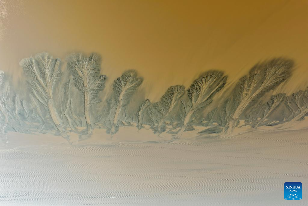 Vista aérea tomada con un dron el 11 de octubre de 2025 de una llanura de marea después del retroceso de la marejada del río Qiantang, en la ciudad de Haining, en la provincia de Zhejiang, en el este de China. La marejada del río Qiantang, famosa por su altura y velocidad, es una atracción turística tradicional en la provincia de Zhejiang. Cada año, olas gigantes rompen en las orillas del río, cerca de la ciudad de Haining. Tras el reflujo de la marea, aparecen diferentes patrones con forma de árbol en la llanura de marea. (Xinhua/Xu Yu)