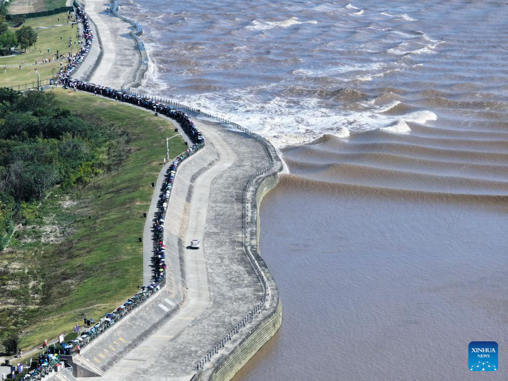 Vista aérea tomada con un dron el 10 de octubre de 2025 de turistas observando la marejada del río Qiantang, en la ciudad de Haining, en la provincia de Zhejiang, en el este de China. La marejada del río Qiantang, famosa por su altura y velocidad, es una atracción turística tradicional en la provincia de Zhejiang. Cada año, olas gigantes rompen en las orillas del río, cerca de la ciudad de Haining. Tras el reflujo de la marea, aparecen diferentes patrones con forma de árbol en la llanura de marea. (Xinhua/Xu Yu)