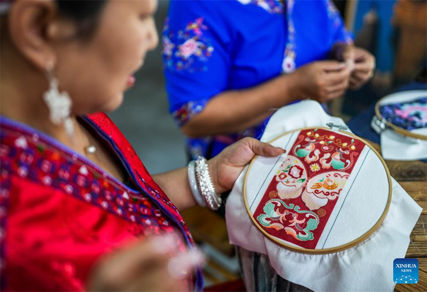Long Luying hace bordados en el taller del distrito de Shibing de la prefectura autónoma de las etnias miao y dong Qiandongnan, provincia de Guizhou, en el suroeste de China, el 10 de octubre de 2025. (Xinhua/Tao Liang).