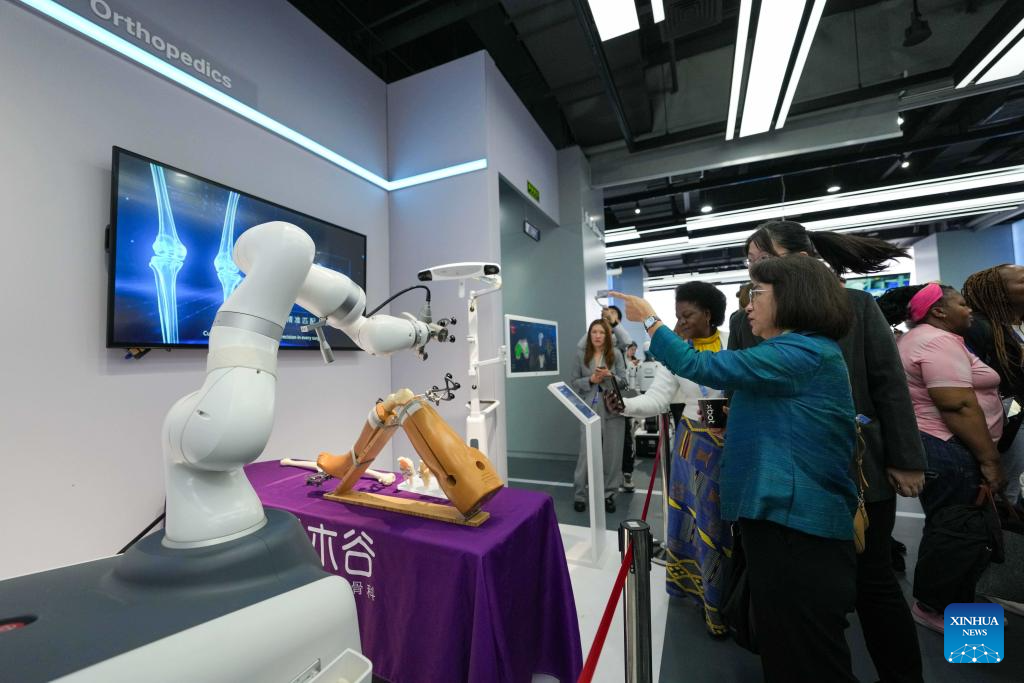 Las representantes se informan acerca de un robot ortopédico con inteligencia artificial en el Mundo de los Robots de Beijing, el 14 de octubre de 2025. (Xinhua/Xue Yuge).
