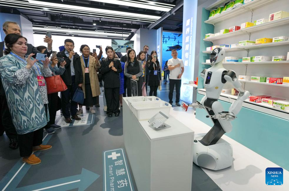 Las representantes observan un robot que despacha medicamentos en el Mundo de los Robots de Beijing, el 14 de octubre de 2025. (Xinhua/Xue Yuge).