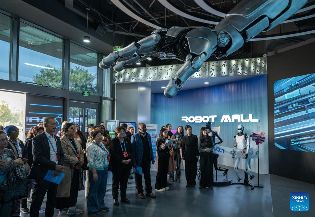 Representantes, quienes se encuentran en Beijing para la Conferencia de Líderes Mundiales sobre la Mujer, visitan el Mundo de los Robots de Beijing, en Beijing, capital de China, el 14 de octubre de 2025. (Xinhua/Du Zixuan)