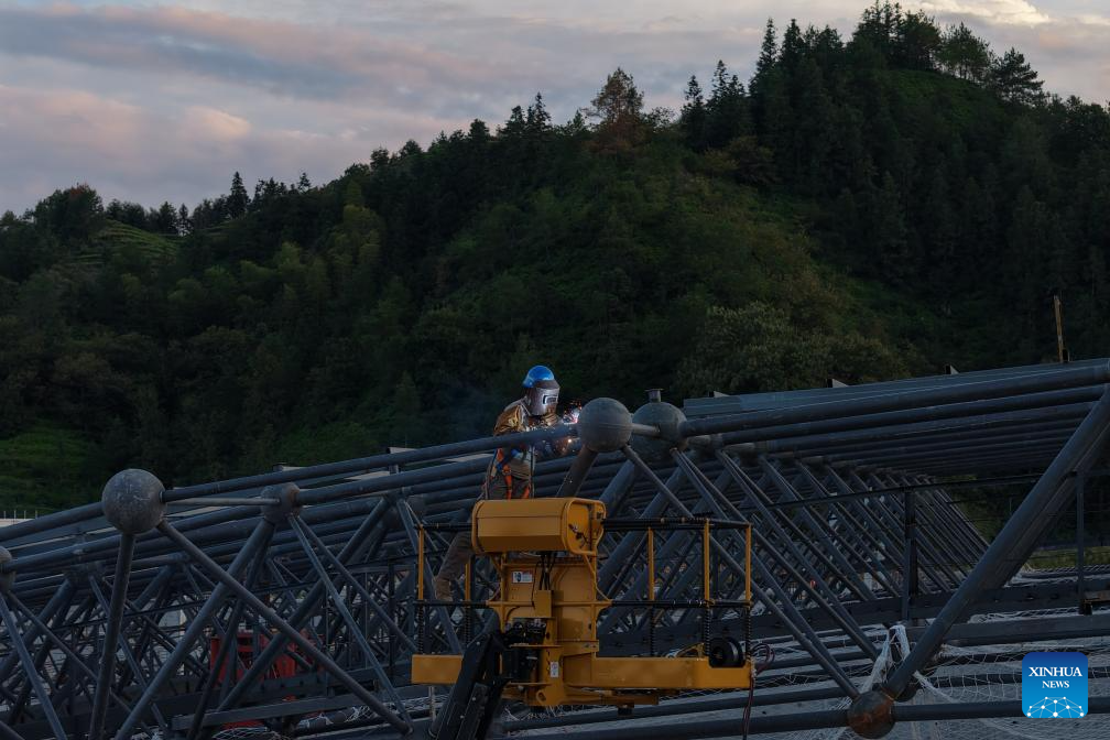 Vista aérea tomada con un dron el 14 de octubre de 2025 de trabajadores laborando en el sitio de construcción de una estación del ferrocarril Quzhou-Lishui, en Lishui, en la provincia de Zhejiang, en el este de China, el 14 de octubre de 2025. La línea ferroviaria de 160 kilómetros mejorará aún más la red ferroviaria regional y promoverá eficazmente el desarrollo del turismo en el suroeste de Zhejiang. (Xinhua/Huang Zongzhi)