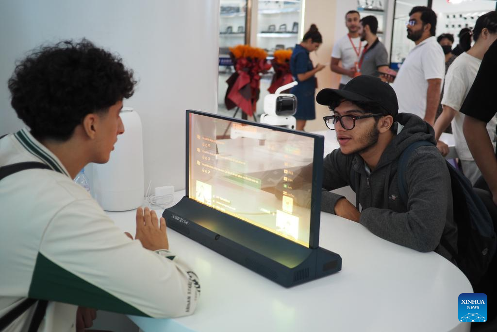 Comerciantes extranjeros prueban un dispositivo de traducción con IA en el Centro Global de Comercio Digital en Yiwu, provincia de Zhejiang, este de China, 14 de octubre de 2025. (Xinhua/Liu Ziyi).