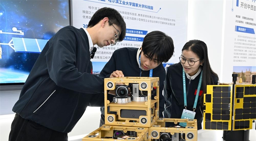 Representantes de los concursantes fotografiados durante la final de la Competición Internacional de Innovación de Estudiantes Universitarios de China 2025 en Zhengzhou, provincia de Henan, centro de China, el 15 de octubre de 2025. Seis equipos de universidades nacionales e internacionales participaron en la final de la competición este miércoles. (Xinhua/Hao Yuan).